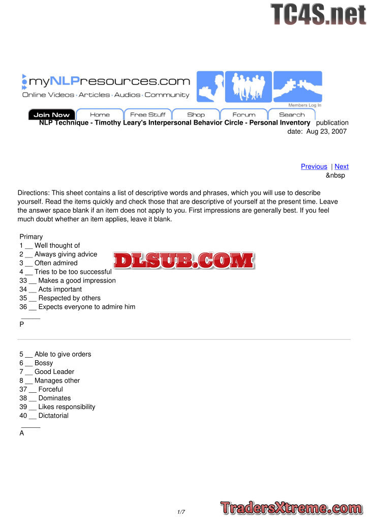 Timothy Learys Interpersonal Behavior Circle Personal Inventory - JPG Image File